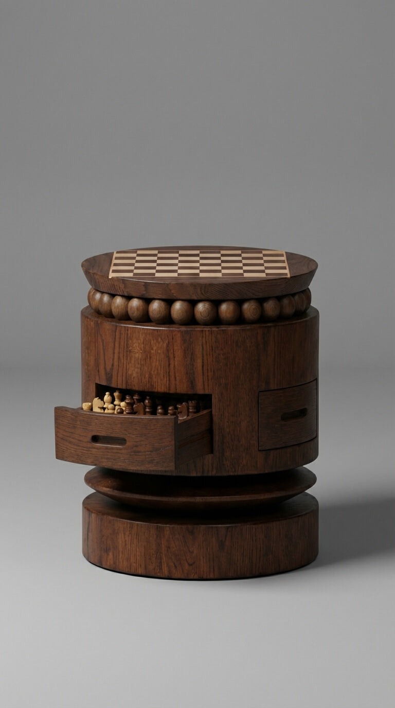 Inspired by vintage European game tables and reinterpreted with modern craftsmanship, this piece blends play, storage, and sculptural form. Rich teak grain, rounded detailing, and balanced proportions make it ideal for living rooms, libraries, lounges, and boutique interiors.