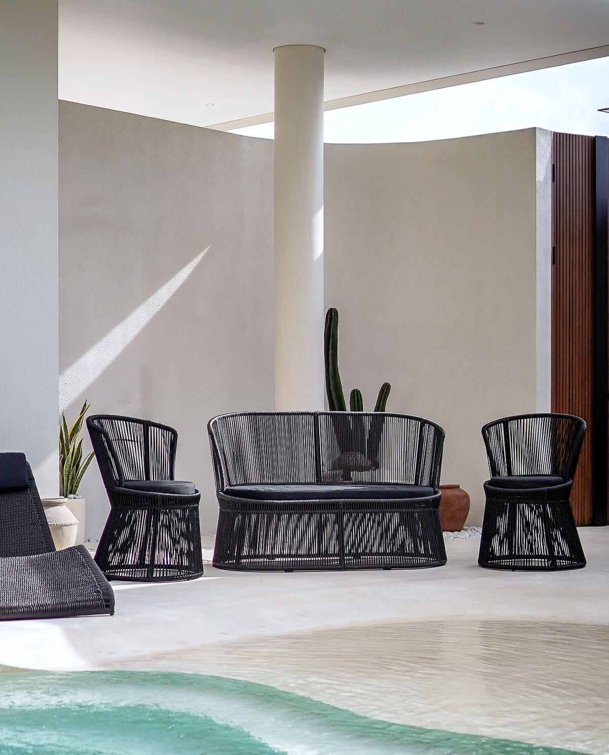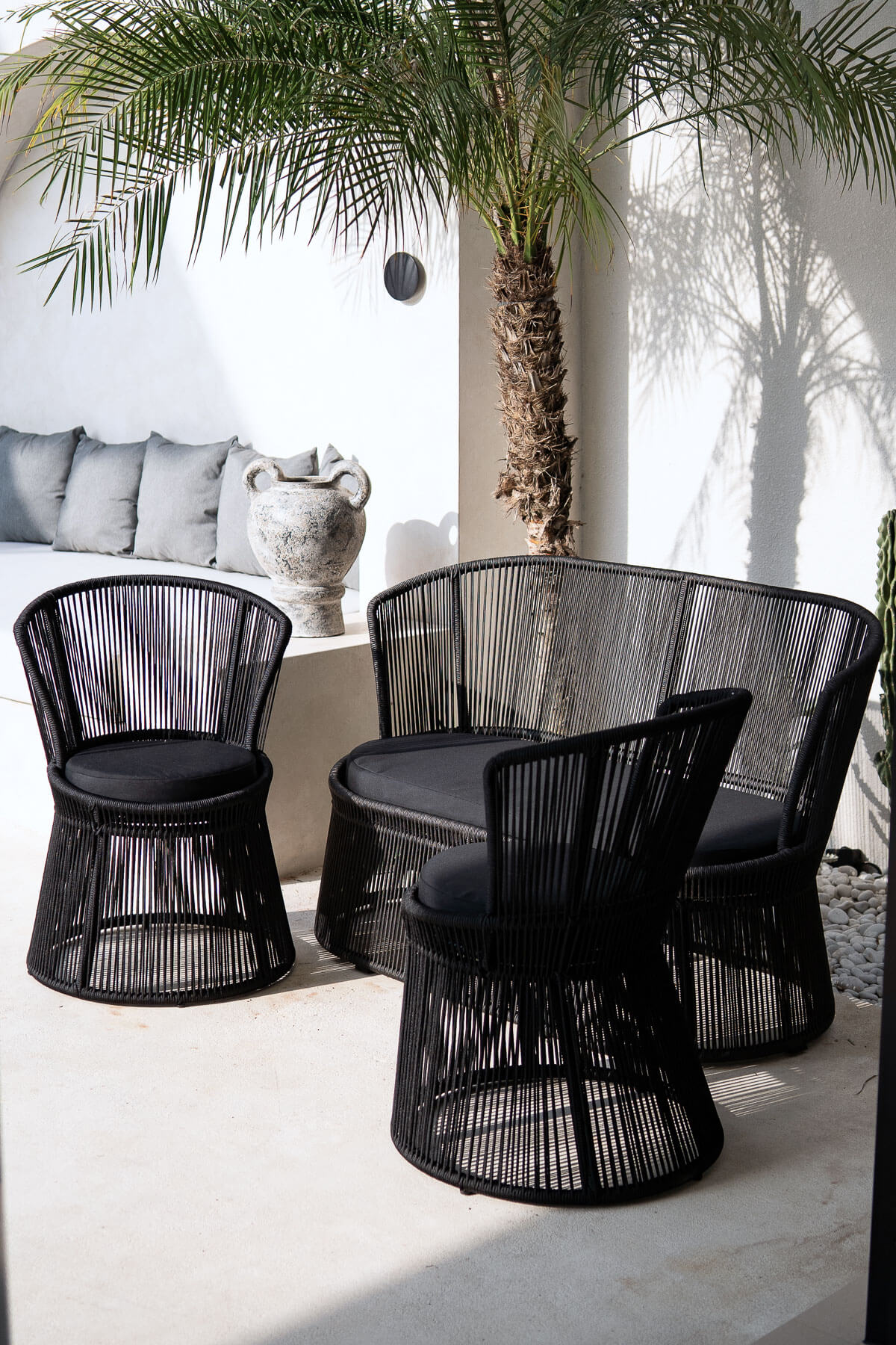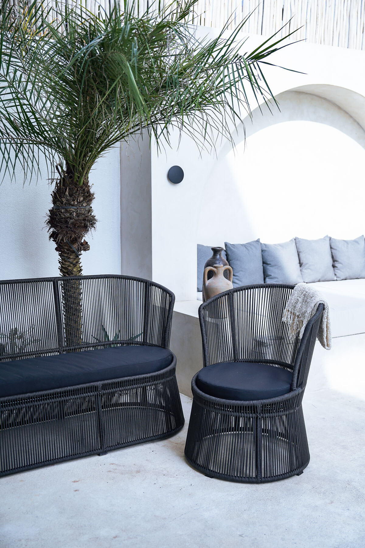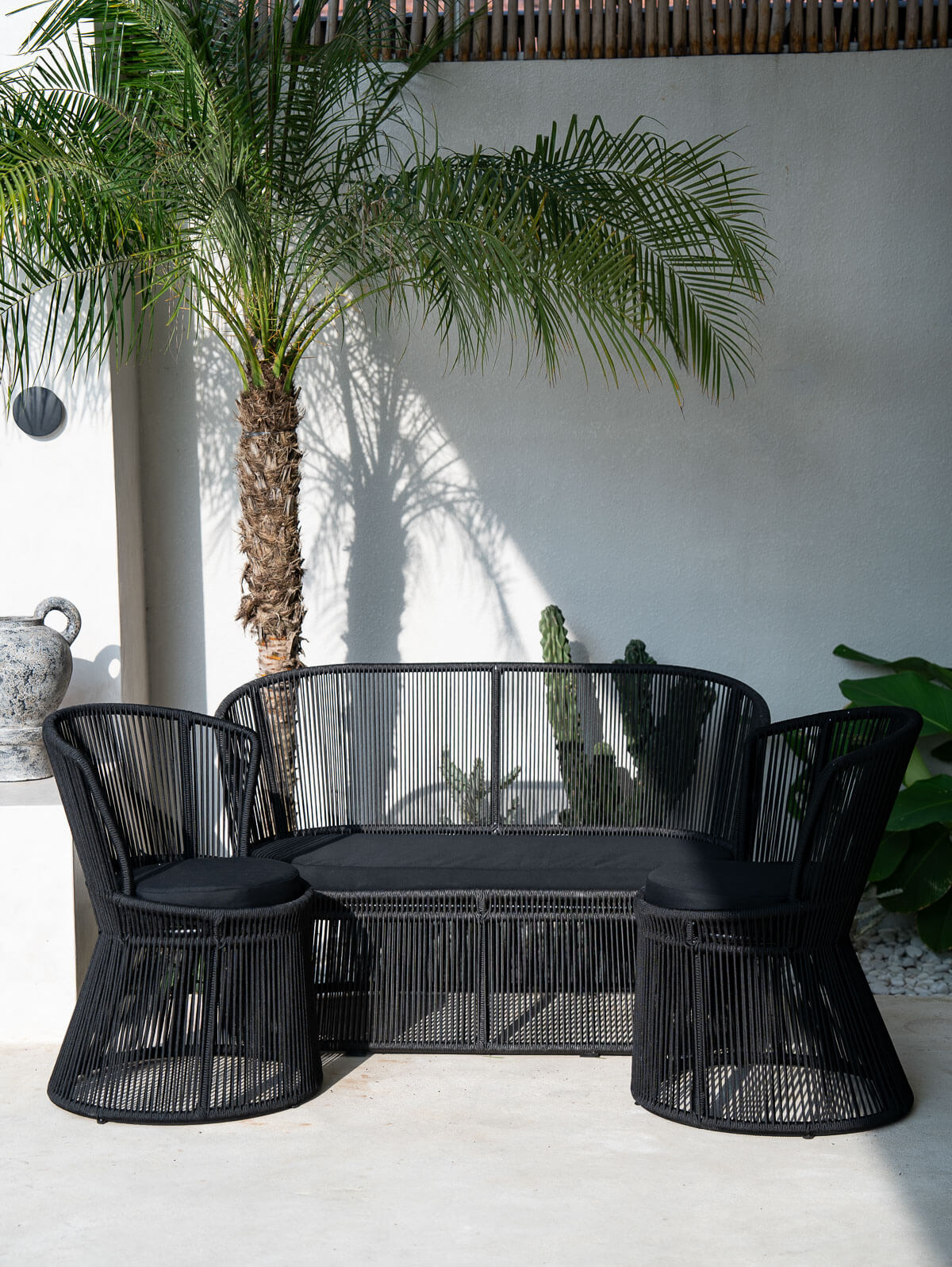 Built on a strong, rust-proof aluminum frame, the sofa combines lightweight construction with exceptional stability. The breathable woven structure creates beautiful shadow play and adds an architectural elegance to any patio or garden.