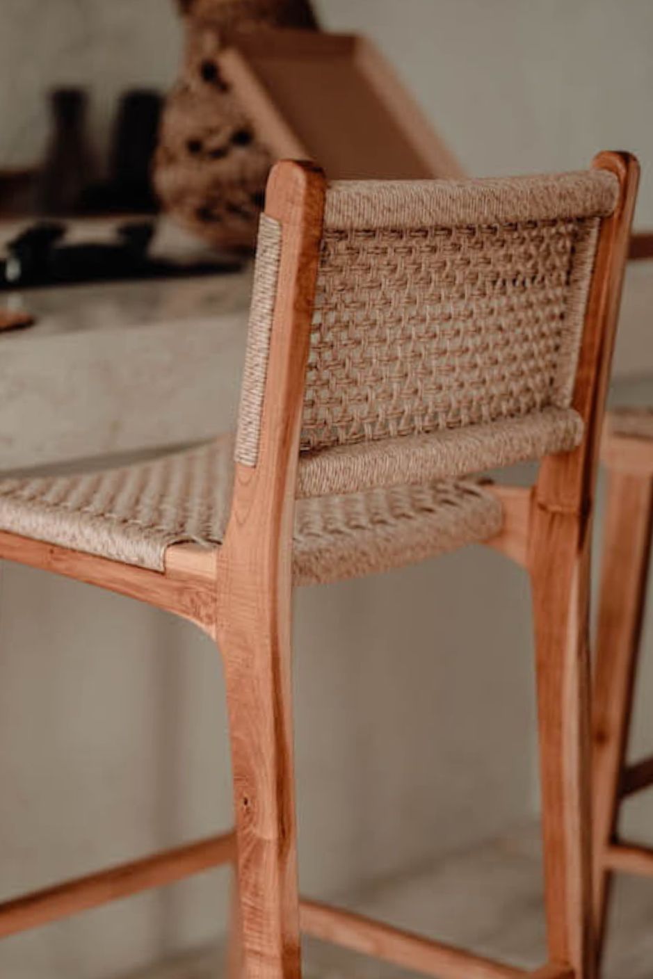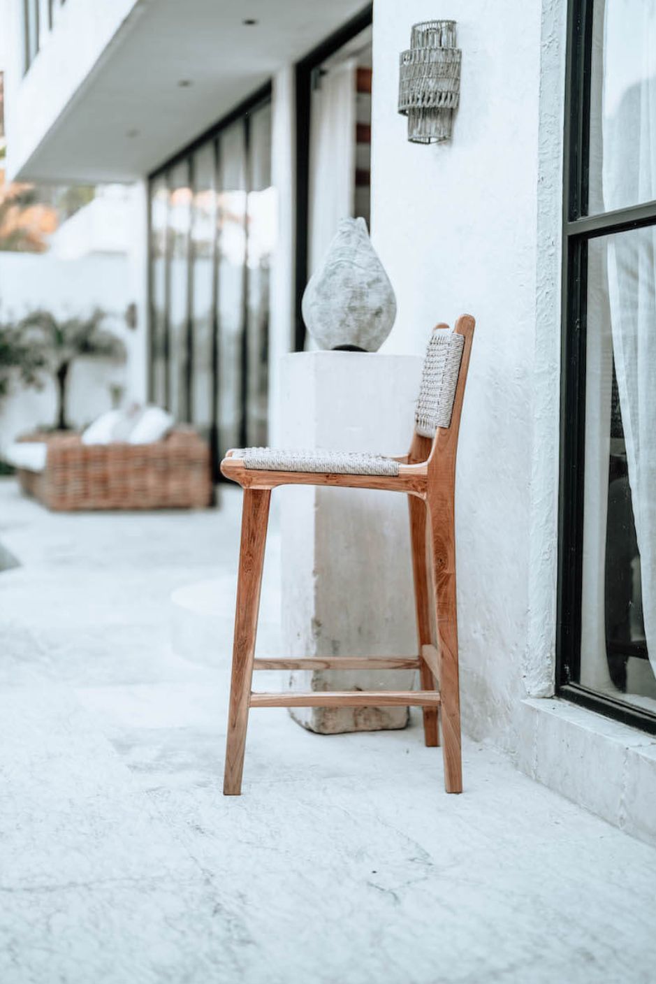 The teak frame ensures strength and stability, while the intricate weave adds an exotic, modern flair. Perfect for kitchen islands, high countertops, or bar areas, the Harrison Stool offers stylish and functional seating that enhances both contemporary and natural-inspired interiors.