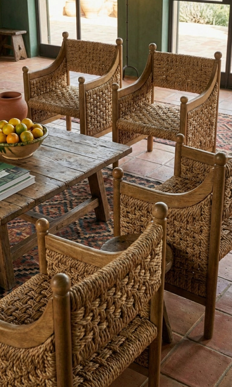 The Nookasa teak wood armchair with hand-woven seagrass seat is a celebration of natural materials and traditional craftsmanship. Crafted from solid teak wood, the chair features gently curved armrests, rounded finials, and a structured frame that balances strength with elegance.